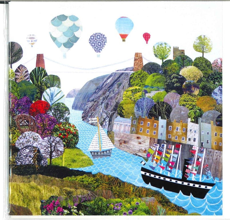 Card features a bright, cheerful collage of the Clifton Suspension Bridge from the original painting by local artist, Jenny Urquhart